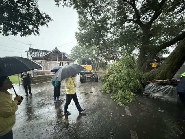 시간당 20㎜가량의 비가 내리고 있는 성주군에서는 저지대에 있는 일부 도로가 침수돼 군청 직원 등이 배수 작업 등을 벌이고 있다.