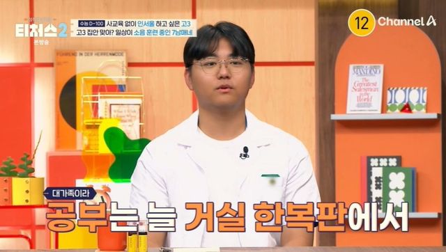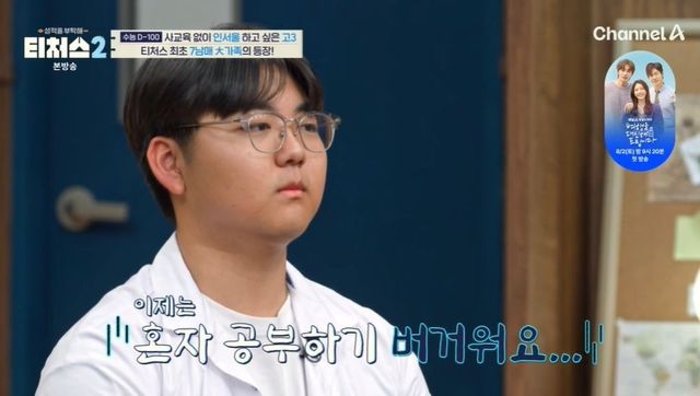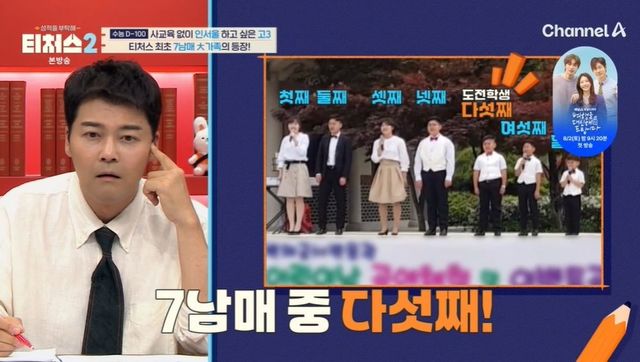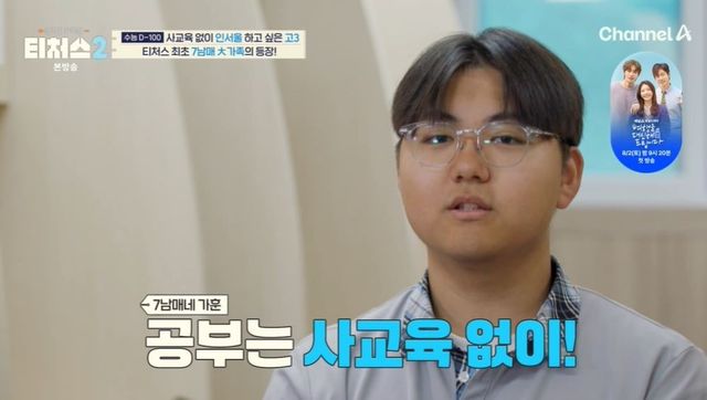 도전 학생은 7남매 중 다섯째로, ‘티처스’ 최초 7남매 가족의 등장이었다. 도전 학생은 “공부만큼은 사교육 없이 공교육으로 하자는 주의다. 형, 누나 모두 혼자 공부에 대학에 입학했고, 저도 고3까지 단 한 번도 학원에 다니지 않았다. 수능이 가까워지는 데 도움을 청할 때도 마땅치 않고, 혼자 공부하려니 버겁다”라고 털어놓았다. 목표는 인서울로, 독립의 로망이 있기 때문.