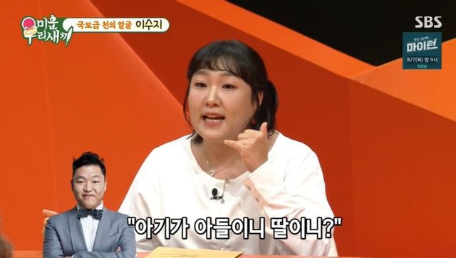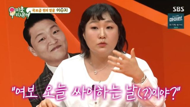 서장훈이 “남편도 싸이 좋아하냐”라고 묻자 이수지는 당황하며 “너무 좋아한다”라고 답했다. 이수지는 “그런 날도 있다. 머리를 묶고 앞머리를 없애고 영상 통화를 하면 ‘오늘 싸이 하는 날이야?’라고 묻는다. 전 예쁘게 꾸민 건데”라고 말해 웃음을 안겼다.