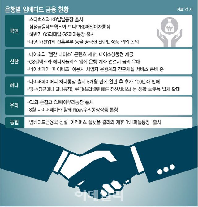 하나은행은 네이버페이머니 하나통장을 출시 5개월 만에 완판(50만좌)한 후 추가 100만좌를 승인받아 판매하고 있다. 하나은행은 당근(당근머니 하나통장), 쿠팡(셀러월렛 빠른 정산서비스) 등 생활 플랫폼 업체와 접점을 늘리고 있다. 우리은행은 최근 CJ와 손잡고 CJ페이우리통장을 출시한 후 다음달 네이버페이와 함께 Npay우리통장상품 론칭을 앞두고 있다. NH농협은행은 올해 임베디드금융국을 신설한 후 이커머스 플랫폼 컬리와 제휴해 최고 연 2.5% 금리를 제공하는 ‘NH퍼플통장’을 출시했다.