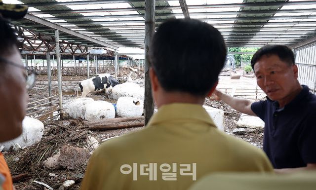 20일 오후 김동연 경기도지사가 간밤에 내린 폭우로 피해를 입은 가평군의 축사 시설을 살펴보고 있다.(사진=경기도)