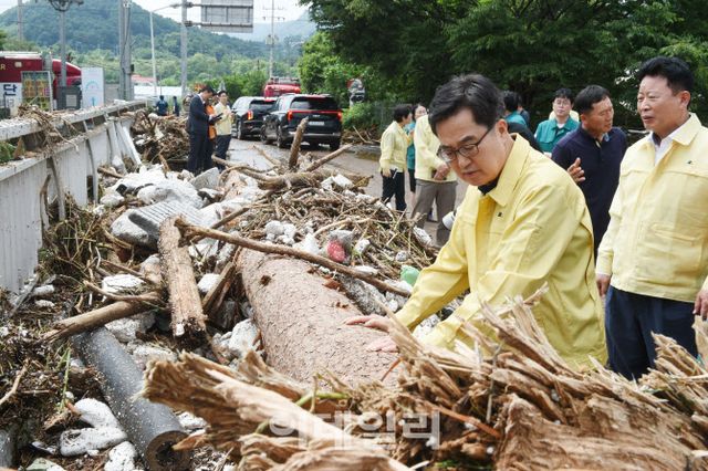 [가평=이데일리 황영민 기자] 김동연 경기도지사가 19~20일 내린 큰 비로 2명이 사망하고, 9명이 실종되는 등 심각한 피해를 입은 가평군을 찾아 통합지원본부 설치를 지시했다. 김 지사는 또 윤호중 행정안전부 장관에게 가평군을 특별재난지역을 즉각 지정해달라고 건의했다.