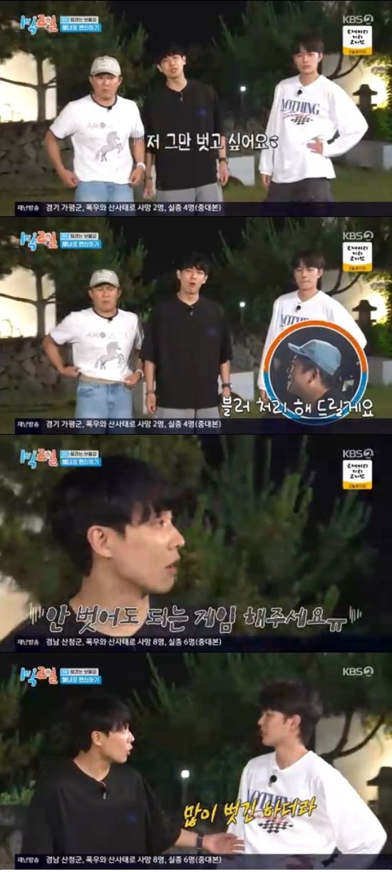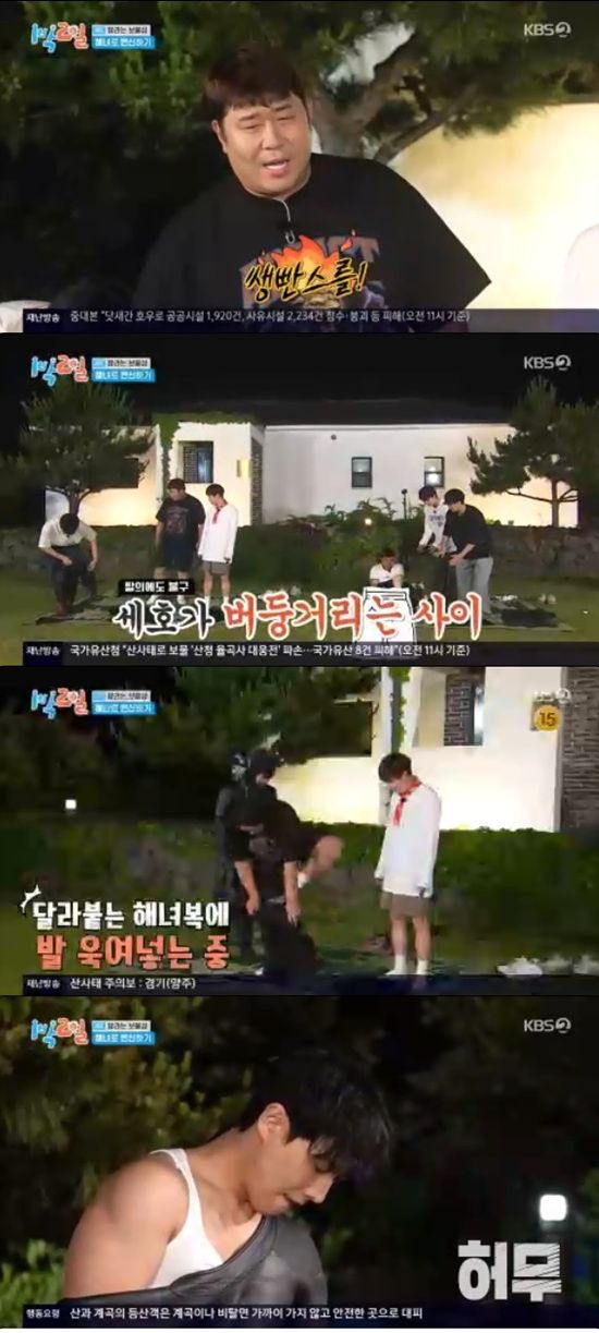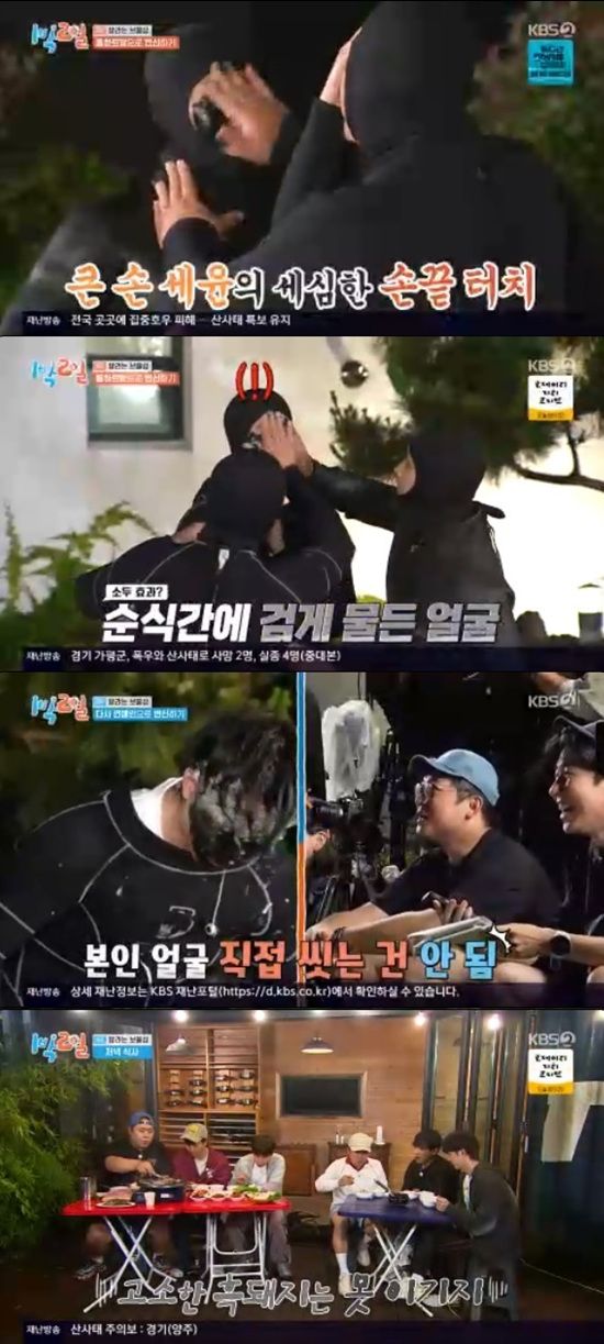 (엑스포츠뉴스 원민순 기자) '1박 2일' 멤버들이 위장크림을 제대로 발랐다.