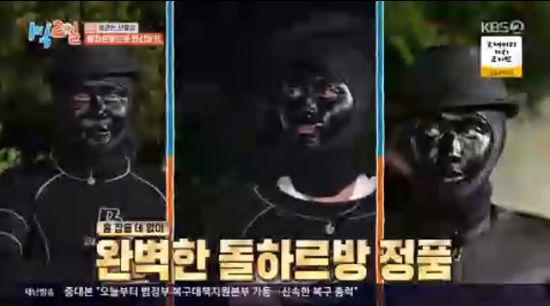 김종민 팀과 이준 팀은 서로 위장크림을 발라줬다. 주종현PD는 딘딘의 미간에서 위장크림이 발리지 않은 빈 곳을 발견하며 이준 팀의 승리를 선언했다.