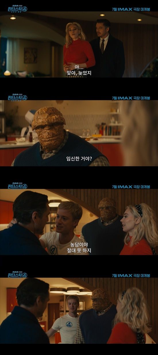 특히 '판타스틱 4 : 새로운 출발'에서는 마블의 대표적인 커플이자 부부인 리드 리처드(페드로 파스칼 분)와 수잔 스톰(바네사 커비)이 가족이자 동료인 판타스틱 4 멤버들에게 임신 소식을 전하는 모습이 먼저 공개되며 아이를 가진 수잔 스톰이 앞으로 마주하게 될 우주적 사건과 위협 속에서 어떤 선택과 결정을 하고 나아갈 것인지 흥미를 높인 바 있다.