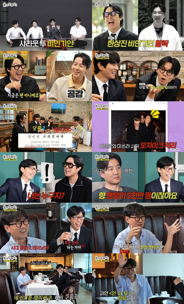첫 번째 초대 대상은 ‘유행어 제조기’ 허경환이었다. 카메라는 그의 얼굴 대신 나뭇잎에 초점을 맞췄고, 팬클럽은 회장과 부회장 싸움 끝에 해체됐다는 웃픈 과거사도 공개됐다. 허경환은 “내 팬들은 숨어 있다”며 자존심을 지켰지만 하하만이 그 고백에 격하게 공감해 묘한 동지애를 형성했다. 유재석은 조심스럽게 ‘인사모’의 취지를 설명하며 “과거형 팬들의 마음에 불을 지펴보자”고 설득했지만 허경환은 쉽게 마음을 주지 않았다.