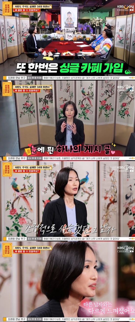 이어 "인터넷에 싱글 카페들이 있다. 거기에 가입했더니 게시글 하나가 눈에 띄었다. 여러 감성적인 글들, 한국의 중년 남성에게 찾기 힘든 (매력이) 인상 깊어서 댓글을 주고받다 만나게 됐다. 저보다 8살 위였고 돌싱이였고 자녀도 있으셨다"라고 말했다.