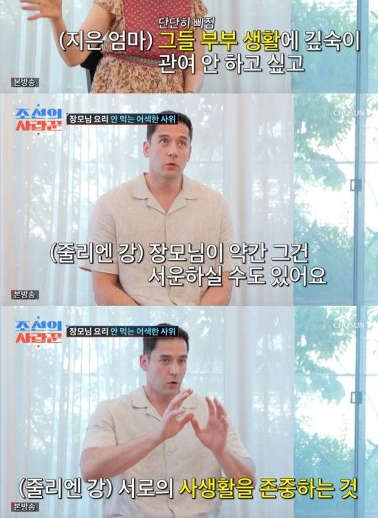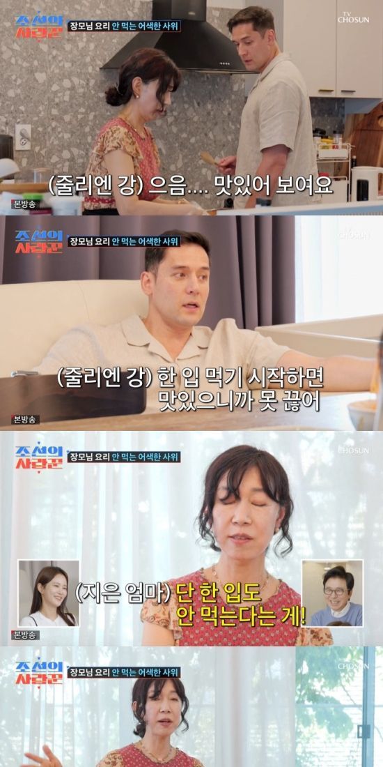 줄리엔 강은 끝내 비빔국수를 먹지 않았다. 결국 제이제이 어머니는 "사위 사랑은 장모라고 하지 않냐. 그래서 저는 정말 잘해주고 싶은 마음이 엄청 많았다. 그러면 줄리엔은 (반응이) '잘해주려고 하는 게 부담스러운가?' 그런 생각이 들더라. 밥도 잘 먹을 줄 알고 했는데 단 한 입도 안 먹는다는 게 너무 속상했다"라며 서운해했다.