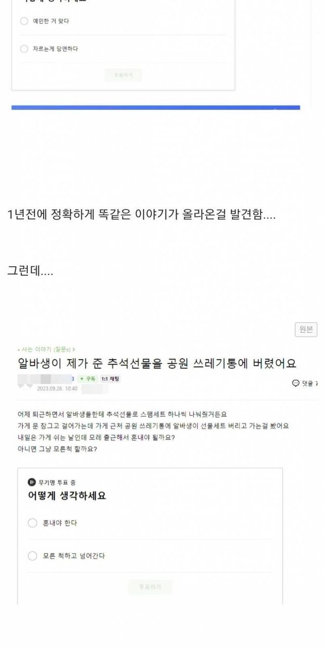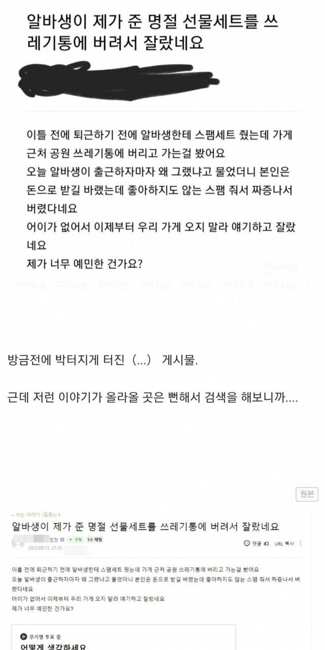 명절 선물 쓰레기통에 버린 알바생 잘린 문제,,