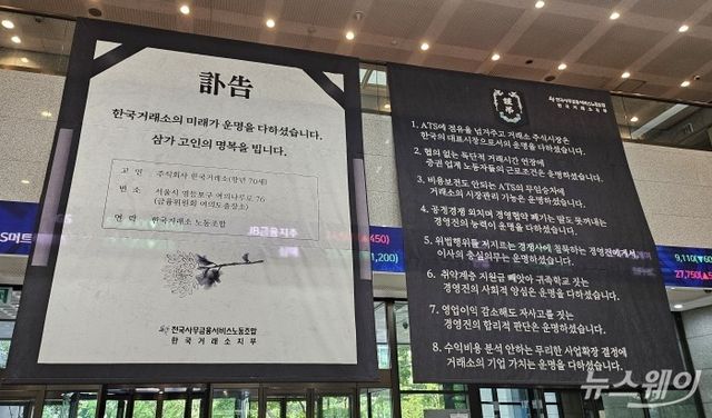 22일 한국거래소 지부는 '부고(訃告)'와 '한국거래소의 미래가 운명을 다하셨습니다'라는 내용이 담긴 현수막을 서울 여의도 한국거래소 1층에 내걸었다.