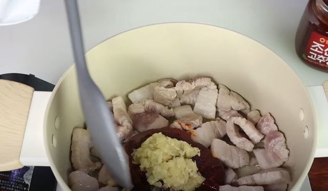 재료는 돼지고기 앞다리살이나 목살, 감자, 양파, 애호박, 청양고추 등 기본적인 채소가 들어간다. 먼저 냄비에 기름을 두르고 고기를 볶아 잡내를 날리고, 양파, 감자를 순서대로 넣어 익힌다. 그 위에 고추장과 고춧가루, 다진 마늘, 간장, 물을 넣고 끓이다가, 애호박과 고추는 마지막에 넣어 식감을 살린다. 뚜껑을 덮고 중약불에서 10~15분 정도 자작하게 졸이면 완성된다.