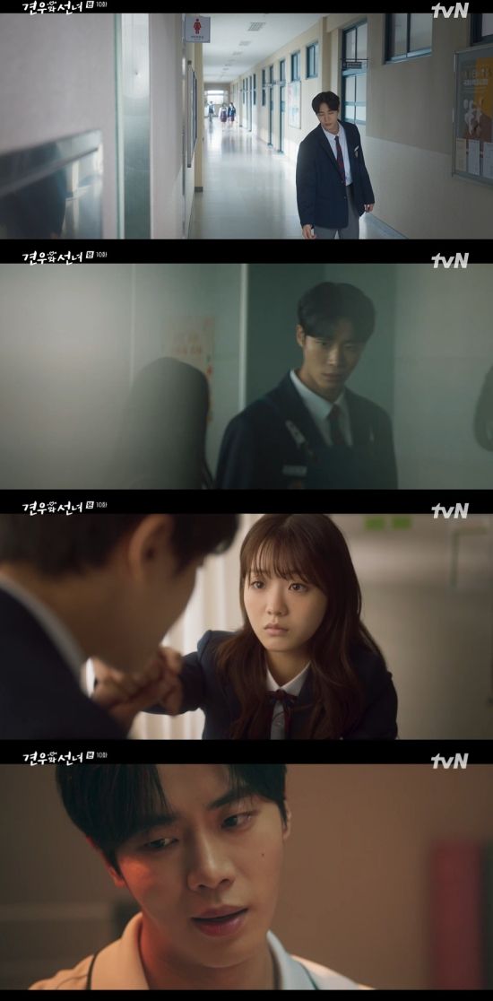 22일 방송된 tvN 월화드라마 '견우와 선녀' 10회에서는 박성아(조이현 분)가 배견우(추영우) 행세를 하는 봉수(추영우)의 정체를 눈치챈 모습이 그려졌다.