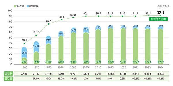 도시 지역 인구 비율은 도시화 현상에 따라 1960년 39.7%에서 2000년 88.3%로 가파르게 증가한 뒤, 2005년(90.1%) 이후 90%대를 유지하고 있다. 지난해 도시지역 인구 비율은 2023년(92.1%)과 2년 연속 동일한 수준을 보였다.