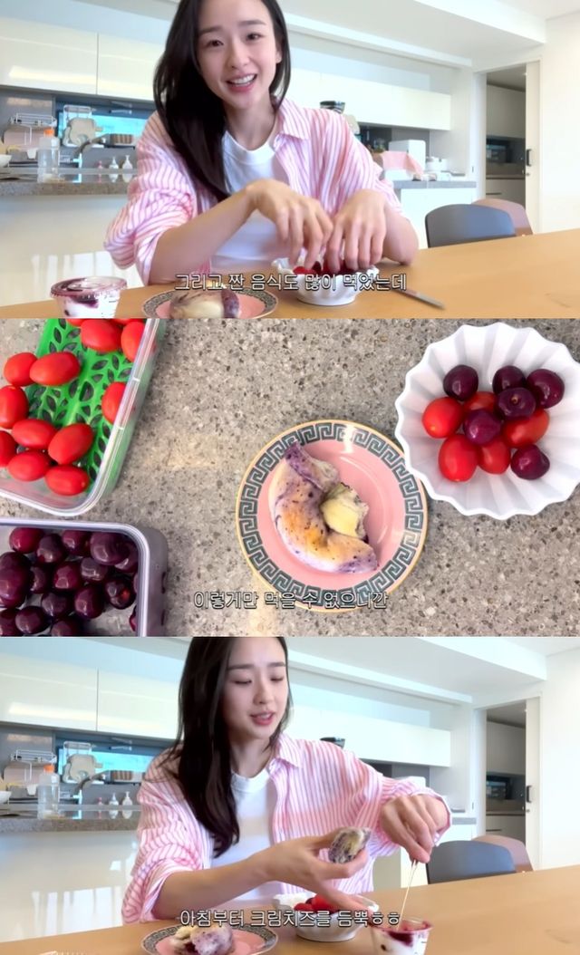 토마토와 체리 몇 개, 전날 먹다 남은 베이글 반 쪽과 크림치즈로 단출한 아침상을 차린 손연재.