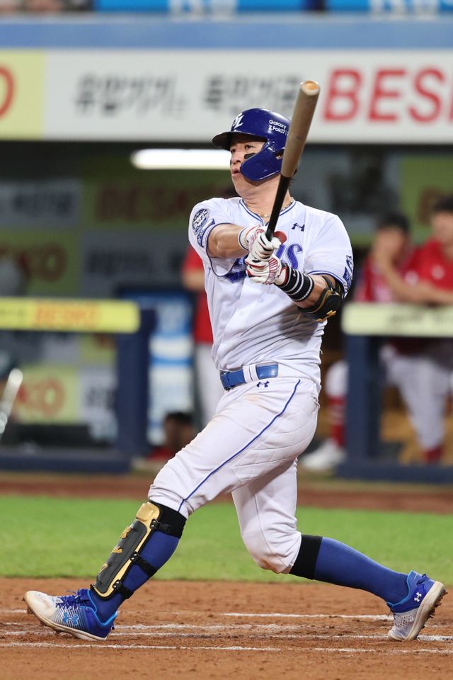 22일 대구 SSG전에서 타격하는 강민호의 모습. 삼성 제공