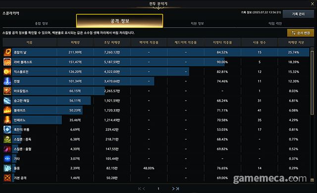 전투 분석기는 종합 정보, 공격 정보, 지원 정보, 타임 라인 등 탭별로 상세한 데이터를 제공한다. 종합 정보에서는 역할군에 맞는 주요 전투 데이터가 기본 표시되며, 순서 변경도 가능하다. 공격 정보 탭에서는 스킬별로 적에게 가한 공격 관련 정보가 막대 그래프 형태로 제공된다.