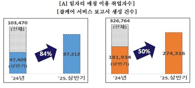 이와 함께 진로탐색, 직업선택, 취업준비를 지원하는 ‘잡케어 서비스’도 이용자가 크게 늘었다. 잡케어는 구직자의 이력서‧자기소개서 등을 AI가 분석해 진로 로드맵, 적합직무, 훈련추천 등을 제공하는 진로상담 도우미로, 특히 청년층의 호응이 컸다. 올해 상반기 잡케어 보고서 생성 건수는 274,316건으로 지난해 같은 기간(181,934건) 대비 50% 증가했으며, 20대 이하 이용자가 90%에 달하는 것으로 나타났다.