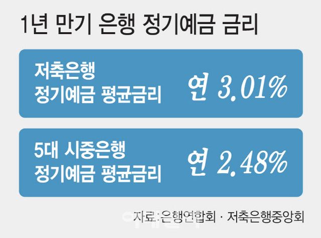 반면 KB국민·신한·하나·우리·NH농협은행 등 5대 은행의 1년 만기 정기예금 최고금리는 연 2.45~2.55% 수준이다. KB국민은행 ‘KB Star 정기예금’·신한은행 ‘쏠편한 정기예금’·하나은행 ‘하나의정기예금’이 연 2.45% 금리를 주며 우리은행 ‘WON플러스예금’은 연 2.50%, NH농협은행 ‘NH올원e예금’은 연 2.55% 금리를 준다.