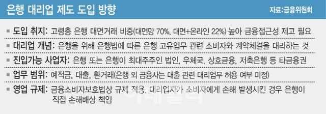 은행 대리업은 65세 이상 고령층의 은행 대면 거래 비중이 높은(70%) 가운데 영업점 감소에 따른 소비자 불편을 줄이기 위해 당국이 추진하는 제도다. 우체국·상호금융·저축은행 등에서 은행 예·적금, 대출, 외환 거래 업무를 볼 수 있다. 은행 간 대리 계약을 맺으면 A은행에서 B은행 적금 상품에 가입하고 C은행 대출 신청도 할 수 있다. 예·적금, 대출 등 은행의 ‘본질적 업무’를 위탁하는 만큼 책임·비용 분담에 대한 논의가 길어지고 있다. 은행권 고위 관계자는 “전국 2500여개 영업점을 가진 우체국에 은행 업무를 위탁하려 해도 전산 시스템 연결, 창구에서 보이스피싱 예방, 소비자보호 조치와 금융사고 발생 시 책임분담 등 논의할 것이 산적해 있다”며 “대리업 도입 필요성은 있지만 실제 시행까지는 얼마나 걸릴지 장담할 수 없다”고 말했다.