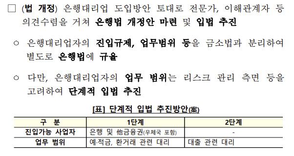 23일 금융권에 따르면 금융위원회와 은행, 우체국 등은 은행 대리업 도입을 위한 실무진 협의를 진행하고 구체적인 사업 방식을 논의했다. 지난 3월 금융위가 “연내 시범운영 서비스 개시를 목표로 상반기 은행·대리업 희망사업자 간 사업방식을 협의하고 7월에 은행 대리업을 혁신금융 서비스로 지정하겠다”고 했으나 애초 목표와는 달리 속도가 더디다.