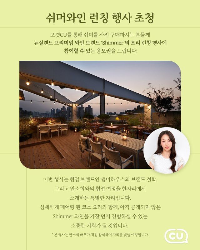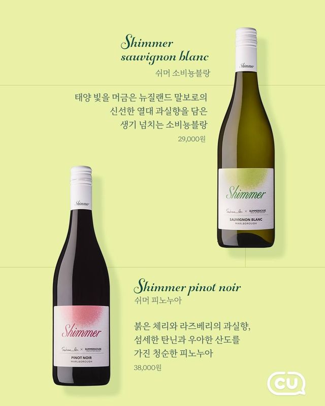 정식 출시는 7월 30일. CU 편의점에서 단독으로 만나볼 수 있다. 현재는 사전 예약 구매를 진행하고 있으며, 사전 구매 고객 중 추첨을 통해 3명에게는 '쉬머 와인 론칭 행사'에 초대되는 특별한 기회가 주어진다. 안소희와 함께, 쉬머 와인과 함께하는 페어링 디너를 즐기고 싶다면? 지금 바로 사전 예약을 서둘러보자.