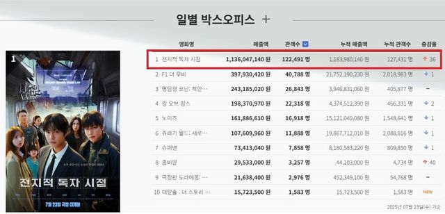 한편, 전날 ‘전독시’에 이어 ‘F1 더 무비’가 40,788명의 관객을 동원하며 박스오피스에서는 2위를 차지했다. 그 뒤로 ‘명탐정 코난: 척안의 잔상'(26,844명), ‘킹 오브 킹스'(22,318명), ‘노이즈'(16,916명)가 박스오피스 상위권에 이름을 올렸다.