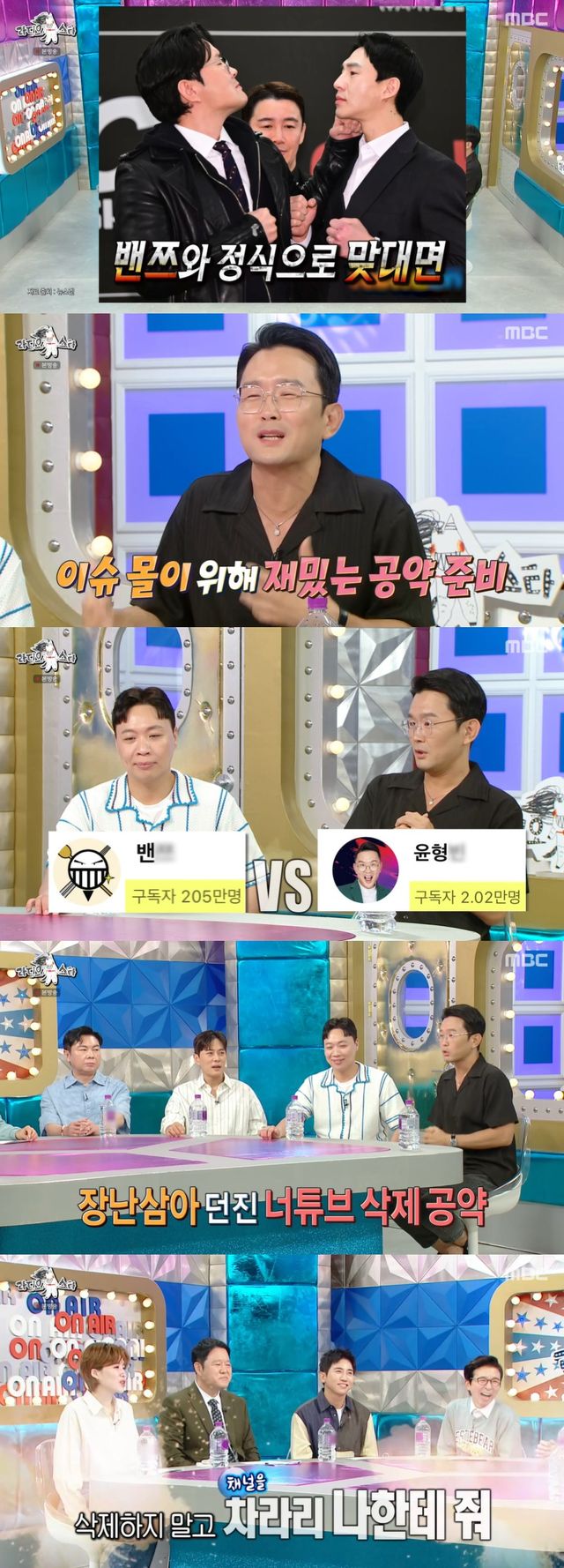 윤형빈은 "근데 밴쯔가 너무 비장하게 '그 정도 각오는 있어야 하겠죠'라고 하니까 갑자기 분위기가 (달아올랐다) 저는 사실 2만이라 괜찮다. 근데 결국 205만 채널을 최근에 삭제했다"라고 말했다.