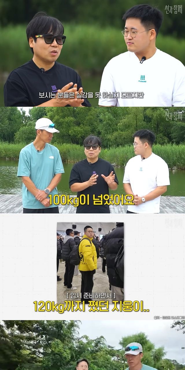 정지웅에 대해 정은표는 "보시는 분들은 실감을 못 하실지 모르지만 군대 가기 전에 100kg이 넘었다"고 말했고, 정지웅은 "120kg 가까이 됐다"며 부연했다.