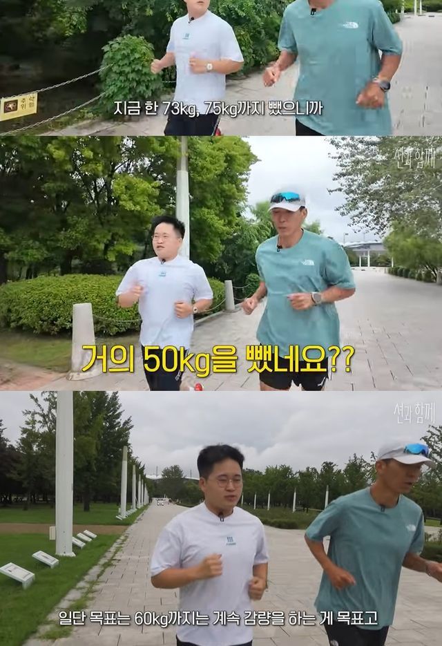 본격적으로 션과 정지웅이 러닝을 시작하며 근황 토크를 나눴다. 군대 전역한 지 일주일이 지났다는 정지웅은 "군대 가기 전에 120kg 찍었는데 지금 73kg, 75kg 뺐다. 사람 하나 거의 날아갔다"며 50kg를 감량한 근황을 전해 눈길을 끌었다.