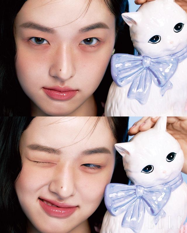 섬세한 새틴 텍스처가 매력적인 레 꺄트르 옹브르, 228 띠쎄 깡봉에 든 부드러운 피치 그레이빛 섀도를 눈꺼풀에 은은하게 발라 깊이감을 주고, 화이트 핑크빛 펄로 눈머리를 감싸듯 덧입혀 투명한 빛을 더해준다. 광대뼈 위쪽을 중심으로 쥬 꽁뜨라스뜨 블러셔, 71 말리스를 퍼뜨려 혈색을 준 뒤, 르 루쥬 듀오, 186 핑크 누드로 세련되고 차분한 무드의 립을 연출한다. 지원이 ‘뽀용~’하게 들고 있는 제품은 8시간 이상 지속되는 컬러와 광택을 자랑하는 르 루쥬 듀오, 186 핑크 누드, 5만9천원, Chanel.