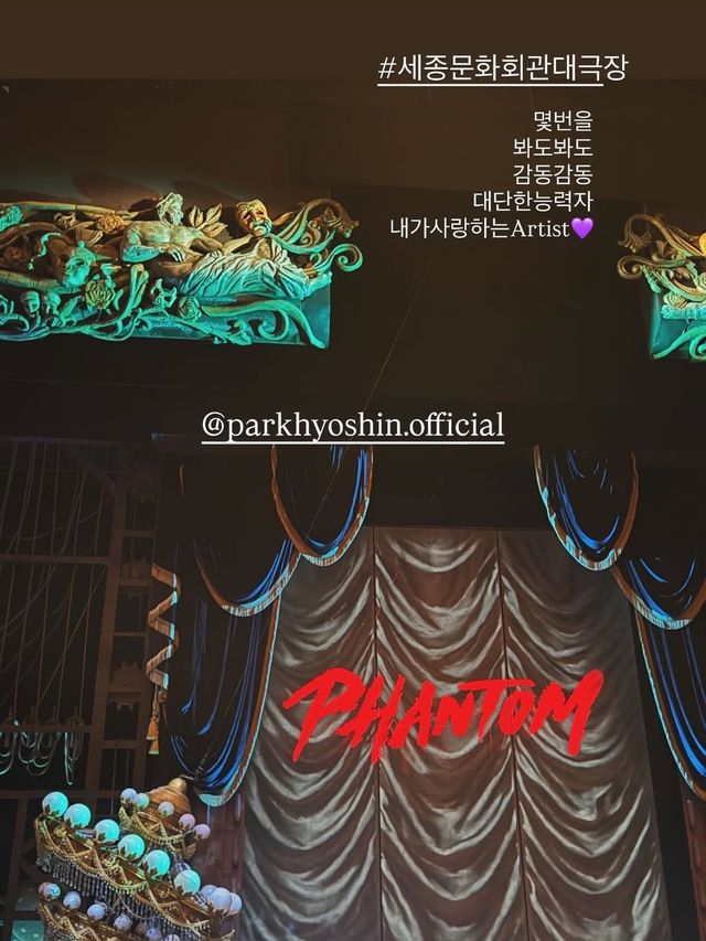 고소영은 24일 자신의 소셜 계정에 세종문화회관 대극장에서 관람한 뮤지컬 ‘팬텀’ 무대 사진과 함께 “몇 번을 봐도 감동. 대단한 능력자이자 내가 사랑하는 아티스트”라는 글을 올렸다. 이와 함께 박효신의 공식 계정을 태그해 변함없는 애정을 표현했다.