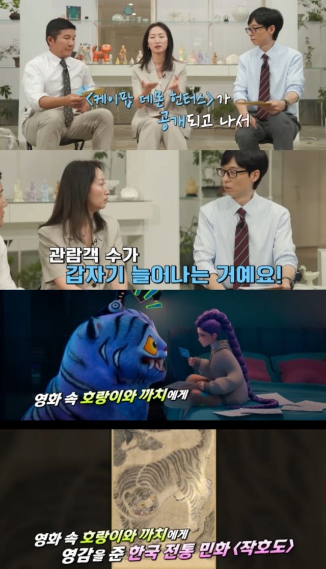 실제 지난 23일 tvN '유 퀴즈 온 더 블럭'(이하 '유 퀴즈')에 출연한 국립중앙박물관 상품기획팀 김미경 팀장은 "호랑이 굿즈가 인기"라고 소개하면서 "'케이팝 데몬 헌터스' 공개 후 박물관 방문자 수가 많이 늘었다. 무슨 일인지 봤더니 극중 '더피'가 '작호도' 속 호랑이와 많이 닮았고, 저희가 상품으로 만들어 놓은 배지와 소품은 금방 품절됐다"고 귀띔했다.