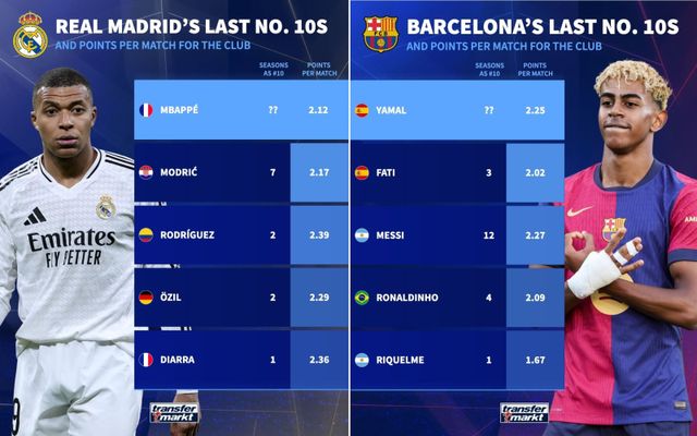 음바페와 야말 모두 10번에 어울리는 성적을 올린 바 있다. 음바페는 레알 합류 뒤 공식전 59경기서 44골 5도움을 올렸다. 야말은 바르셀로나에서만 통산 106경기 25골 34도움을 기록했다.