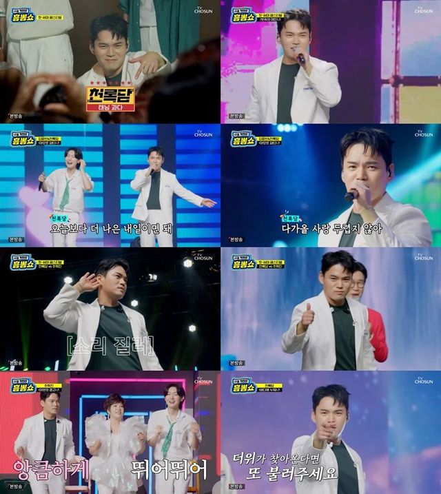 천록담은 게스트 김연자를 필두로 김용빈, 최재명, 남승민과 ‘빗속의 여인’으로 귀가 뻥 뚫리는 고음을 선사하며 짜릿한 에너지를 선사했다.