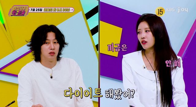 또한 김희철이 “미주는 다이어트 안 하지 않냐”라고 물었고, 이미주는 “원래 했는데 지금은 안 한다”고 답한다. 이에 김희철이 가장 심하게 했던 다이어트에 관해 묻자, 이미주는 “아침에 닭가슴살 하나 먹고 하루 종일 안 먹었다. 그런데 그때가 제일 못생겼고 제일 안 예뻤다”라고 회상한다. 그러자 김희철은 “지금도 (다이어트) 하고 있는 것 같은데 당장 멈춰라”라고 말하며 웃음을 자아낸다.