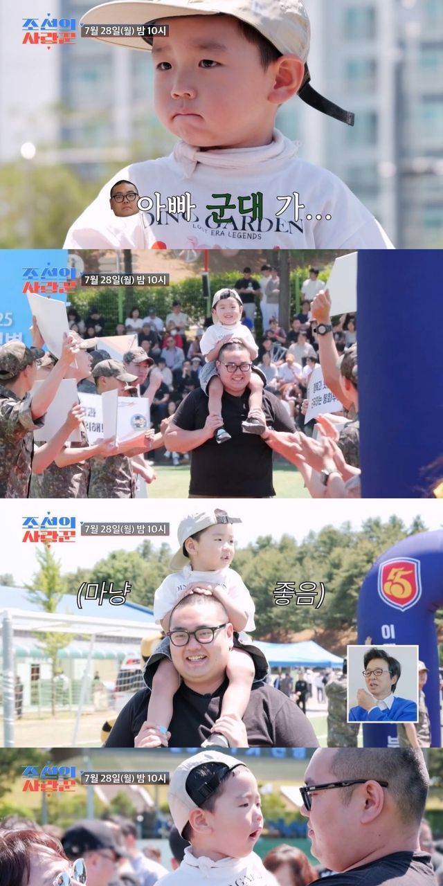 28일 오후 방송될 ‘조선의 사랑꾼’에서는 이경실의 아들 손보승이 마침내 입대 당일을 공개한다. 선공개 영상에서 손보승은 아들 이훈을 목말 태우고 “이훈아, 아빠 군대 간다!”라며 입소식이 열리는 훈련소로 향했다. 새 훈련병들을 반기는 군악대에, 엄마 이경실도 “이훈이 어서 오라고 밴드가 있다”고 말하며 분위기를 끌어올렸다. 훈련소 앞에는 아이스크림을 파는 ‘푸드트럭’까지 있었다. 예전과는 많이 다른 입대 풍경에 김국진은 “지금까지는 축제인데?”라며 눈을 휘둥그레 떴다. 이어 아빠의 어깨 위에 안정적으로 탄 이훈이 등장하자 선배 장병들은 환호로 반겼고, 아무것도 모르는 이훈의 기분은 최고조에 달했다.