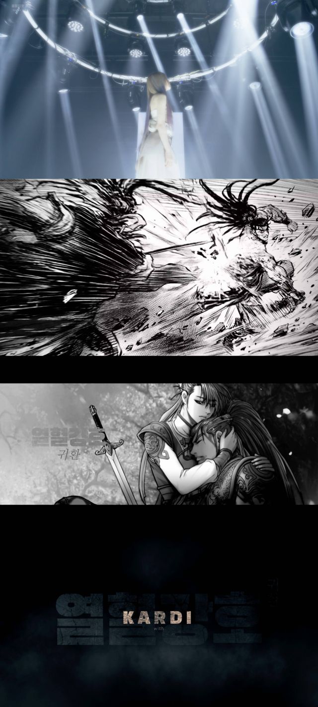 첫 번째 티저에서는 ‘열혈강호: 귀환’과 카디의 컬래버레이션을 예고한다. 먼저 흑백 일러스트로 재현된 원작 만화 ‘열혈강호’의 치열한 전투 신이 펼쳐진다. 여기에 웅장한 오케스트라 선율이 더해져 무협 게임 특유의 긴장감과 몰입도를 극대화한다. 말미에는 ‘‘열혈강호: 귀환’ with 카디’라는 타이포가 등장해 게임과 음악이 만나 만들어낼 시너지에 대한 호기심을 자극한다.