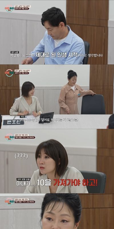 가장 먼저 재산 분할에 관한 조정이 시작됐다. 남편 측의 박민철 변호사는 "먼저 말씀을 드리면 채무(2천만 원)를 분할해야 하는 상황이다. 남편분이 이건 아내가 10을 가져가야 하고, 남편은 부담할 게 없다고 생각하셨다"고 해 조정장을 술렁이게 했다.