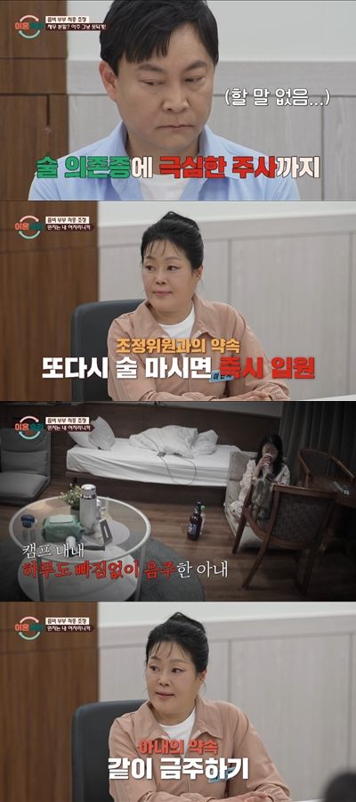 남편은 "현재 일주일째 술을 참고 있다. 퇴소 후에도 꾸준히 알코올 상담 치료나 경제 활동을 열심히 할 예정"이라고 밝혔고, 서장훈이 "또 (술을) 입에 대는 걸 발견하면 바로 입원하는 걸로"라고 하자 "알겠다"며 수긍했다.