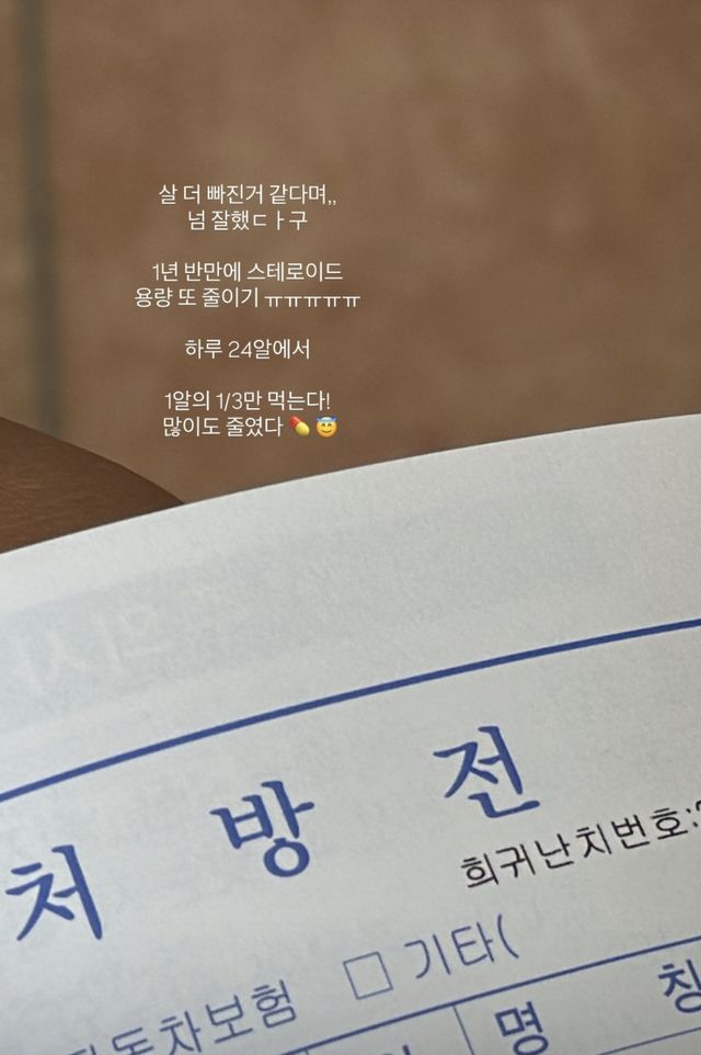 최근 ‘뼈말라’ 스타일로 급격한 체중 감량을 해 누리꾼의 걱정이 커졌음에도 긍정적인 모습이 눈길을 끈다. 그는 이어 “1년 반만에 스테로이드 용량 또 줄이기ㅠㅠㅠㅠ 하루 24알에서 1알의 1/3만 먹는다! 많이도 줄였다”며 스테로이드 복용량을 줄였음을 알렸다.