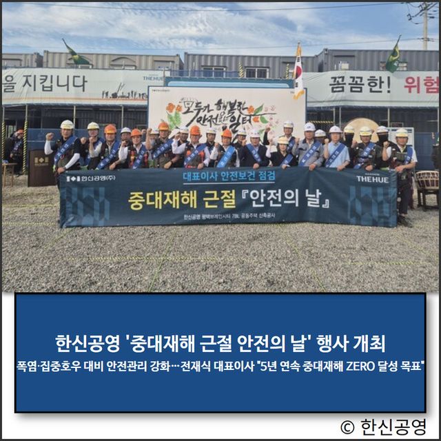 한신공영은 이미 지난 6월부터 전 현장을 대상으로 폭염 및 붕괴 등 계절별 주요 위험요소에 대응한 특별안전점검을 강화해오고 있다. 특히 폭염안전 5대 기본수칙을 체계적으로 이행하기 위한 '폭염 작업 프로그램'을 현장에 적용하고, 집중호우에 대비한 현장 맞춤형 안전보건대책도 병행하며 현장 관리 고도화에 나서고 있다.