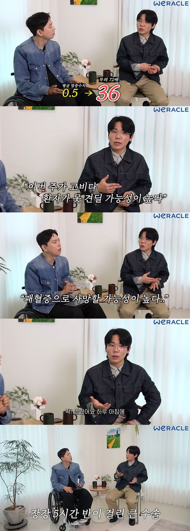 아내만 따로 불러서 '이번 주가 고비다. 못 견딜 가능성이 높다. 패혈증으로 사망 위험이 높다. 오늘내일 삼 일 뒤 굉장히 조심하셔야 할 것 같다'고 얘기했다더라. 퇴원하고 알았다"라고 덧붙였다.