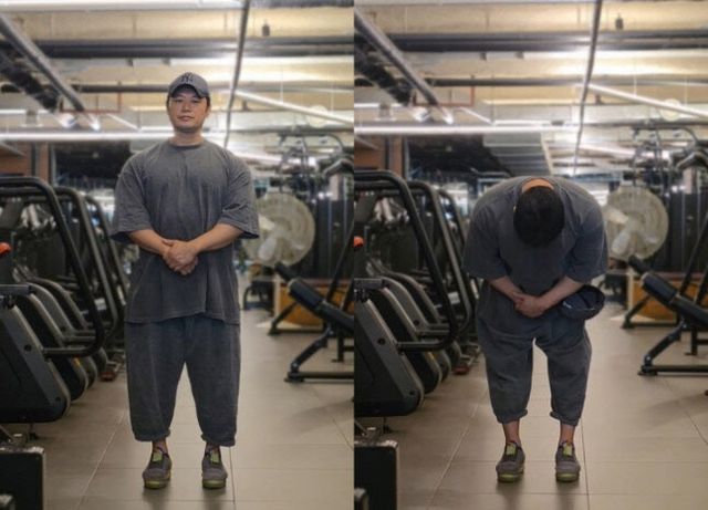 공개된 사진에는 양치승이 두 손을 모은 채로 모자를 벗고 90도로 인사하는 모습이 담겼다. 어두운 표정이 안타까움을 자아냈다.