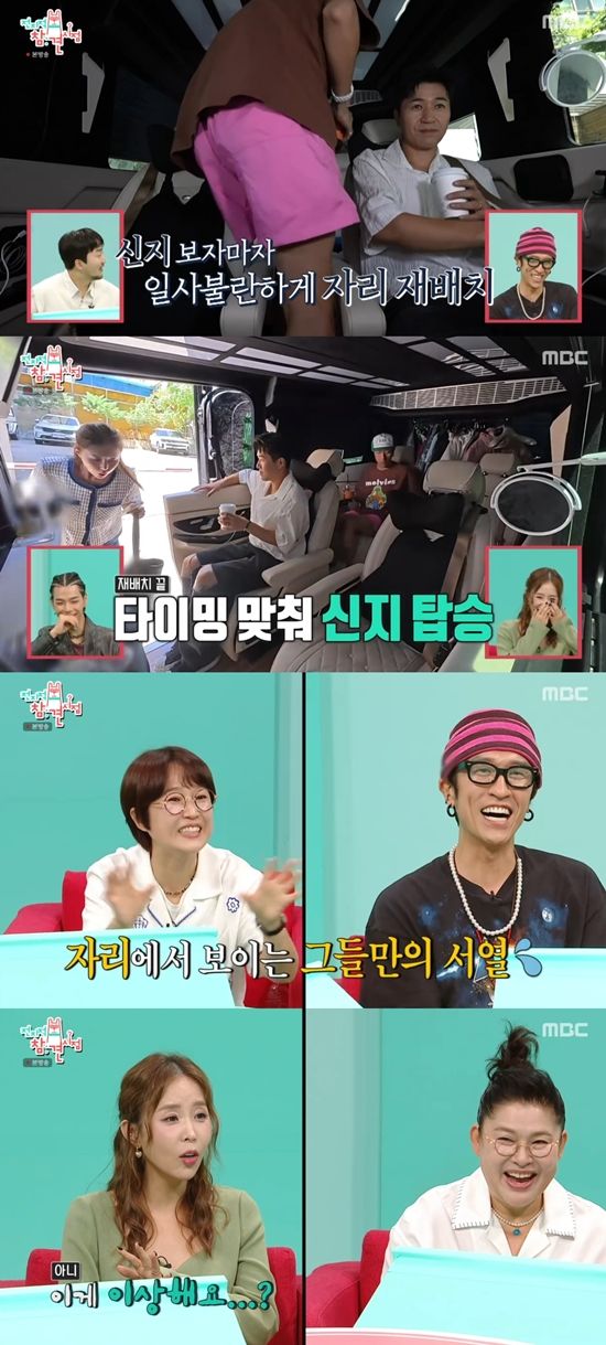 신지가 차에 타자 빽가가 뒷자리로 옮기고, 김종민이 빽가의 자리로 옮겼다. 이 모습을 본 송은이가 "한때 유행했던 서열 정리다"라며 웃었다. 빽가는 "그냥 자연적으로 이렇게 된다. 저기가 원래 신지 자리다"라고 설명했다. 신지는 "이게 이상하냐?"라며 의아해했다.