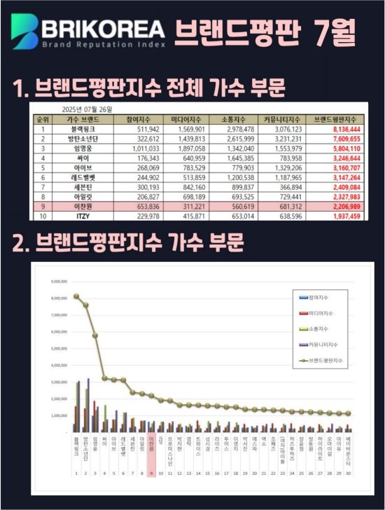 한편, 7월 가수 브랜드평판은 2025년 6월 26일부터 7월 26일까지 수집된 가수 브랜드 빅데이터를 기반으로 한다.
