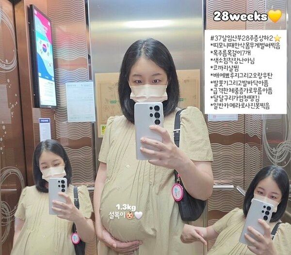 "설복이(태명)는 1.3㎏으로 무럭무럭 자랐다. 벌써 띠모니 때 만삭 몸무게 찍어서 걱정했는데 임당도 한방에 통과했다"면서 "근데 요상한 증상이란 증상은 다 겪는 듯하다. 나이는 어쩔 수 없나보다"라고 설명했다.