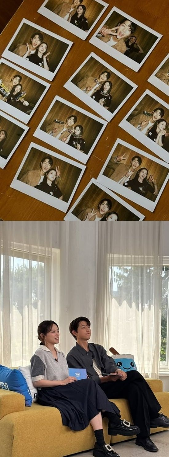 공개된 사진에는 송중기와 함께 밝은 표정으로 폴라로이드 사진을 촬영하고, 케이크를 들고 미소 짓고 있는 천우희의 모습이 담겨 있다.