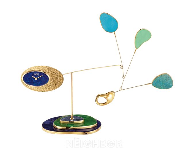 문화 격변기인 1960년대, 피아제는 시대 흐름에서 영감 받아 형태를 자유자재로 바꾸는 시계와 주얼리를 빚어냈다. 그 창의성은 피아제의 새로운 작품인 키네틱 아트 형태의 하이 주얼리 모빌 ‘엔드리스 모션’에서 끊임없는 움직임으로 구현된다. 프랑스 출신 조각가 알렉스 팔렌스키(Alex Palenski)와의 협업으로 탄생한 조각 작품 모빌은 유희성과 정교함, 대담함이 조화를 이루며 올해 하이 주얼리 컬렉션의 테마 ‘셰이프 오브 엑스트라레간자(Shapes of Extraleganza)’와도 자연스럽게 맞닿는다. 작품의 중심에 자리한 블랙 오팔 다이얼은 ‘피아제가 바라보는 세상은 마치 다양한 취향과 감성을 지닌 오팔과도 같다’는 이브 피아제의 철학을 떠오르게 한다. 쿼츠 무브먼트로 구동하는 골드 핸즈 아래, 각기 다른 색채와 투명도를 지닌 오팔이 빛나고 모든 작품은 세상에 하나뿐인 존재가 된다. 피아제의 시그너처 세공 기법인 데코 팰리스로 완성한 골드 케이스가 다이얼을 감싼 채 모빌이 움직일 때마다 눈부시고 매혹적인 효과를 선사한다. 골드 시계는 유기적인 형태로 세공된 오너먼트 스톤과 완벽하게 어우러지며 자연과의 교감을 보여준다. 형태가 조금만 변해도 모빌의 움직임이 달라지는 만큼, 작품의 균형을 유지하는 일은 절대 쉽지 않은 도전이었다. 기술과 미학 사이에서 완벽한 균형을 이루는 것, 정교한 워치메이킹과 하이 주얼러 감각을 겸비한 피아제만의 오랜 노하우가 고스란히 드러난다.