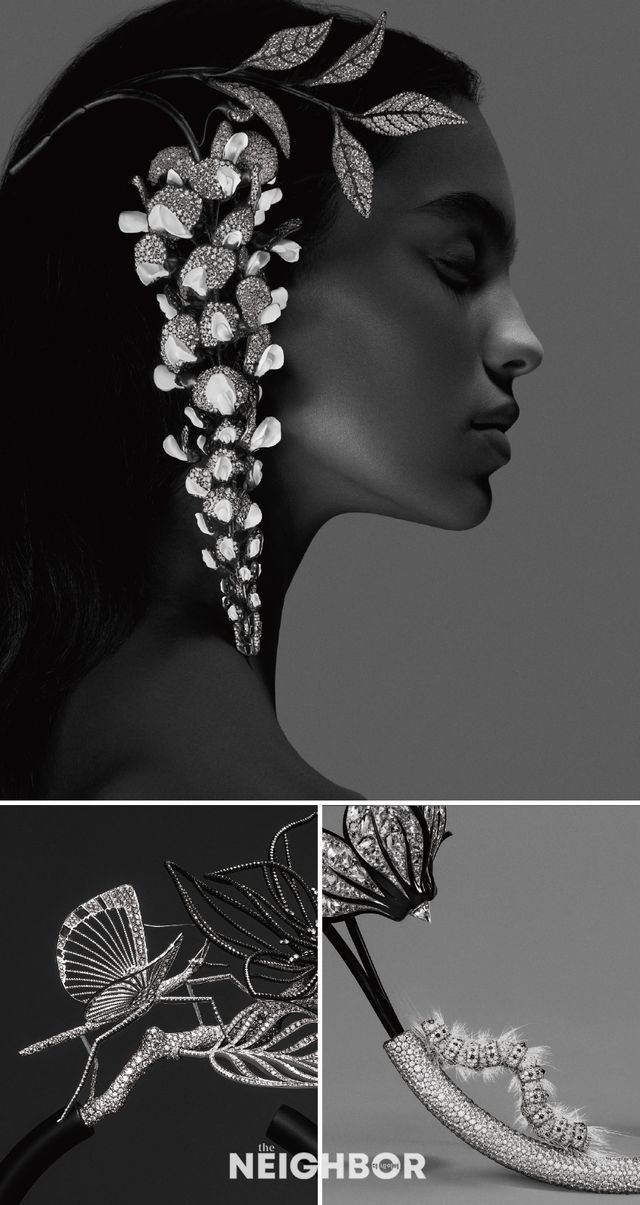 부쉐론의 크리에이티브 디렉터 클레어 슈완(Claire Choisne)은 까르뜨 블랑슈(Carte Blanche) 컬렉션을 통해 자연에 대한 개인적인 해석을 제안한다. 2018년 선보인 하이 주얼리 ‘이터널 플라워(Eternal Flowers)’로 시작된 ‘덧없는 것을 영원하게 만들고자 했던’ 창조적 여정을 이어가며, 올해는 ‘임퍼머넌스(Impermanence)’ 컬렉션을 통해 자연의 본질을 포착하고, 그 아름다움을 더 깊이 바라보며 보호할 수 있도록 구상했다. 이번 컬렉션은 일본의 꽃꽂이 예술인 ‘이케바나(ikebana)’와 그 속에 담긴 ‘와비사비(wabi-sabi)’ 미학에서 영감을 받아 탄생했다. 덧없는 찰나의 아름다움을 정지시킨 듯한 식물 조형물 6개는 가장 밝은 ‘컴포지션(Composition) n°6’부터 가장 어두운 ‘컴포지션(Composition) n°1’까지, 자연이 점차 소멸해가는 흐름을 상징한다. 임퍼머넌스 컬렉션 전반을 관통하는 주제는 바로 ‘빛’. 처음에 모든 것을 감싸던 빛이 점차 사라지면서 완전한 어둠으로 전환되며 자연의 순환을 암시한다. 조형물 6개는 총 28점의 착용 가능한 하이 주얼리 작품들로 구성된다.