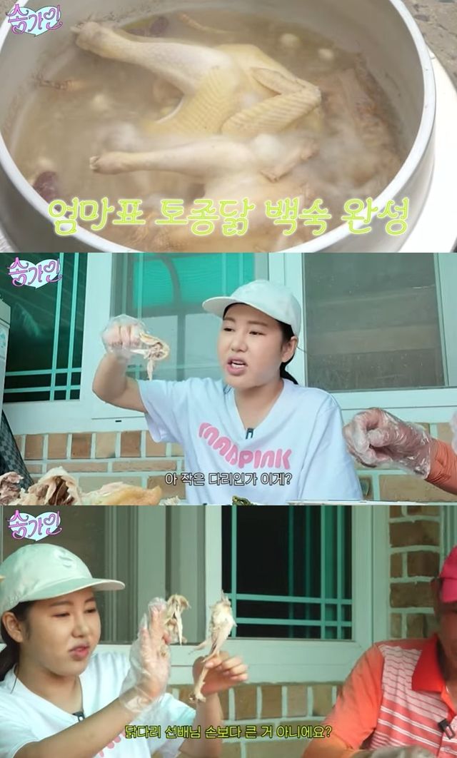 제작진이 "내려올 때마다 송가인에게 닭을 잡아주냐"고 묻자, 송가인 어머니는 "올 때마다 해준다. 작은 아들은 토종닭을 사서 보내준다. 여기 자연에서 키운 것"이라고 답했다.